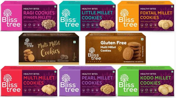 Package contains 8 packs 75g each - 1 x Foxtail Cookies, 1 x Kodo Cookies, 1 x Little Cookies, 1 x Multi-Millet Cookies, 1 x Ragi Cookies, 1 x Pearl Cookies, 1...